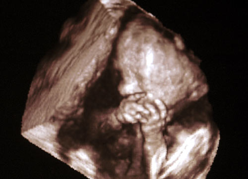 Fetus artık hem vaginal hemde abdominal( karın) ultrasonografi ile rahatlıkla değerlendirilebilir. Baş-popo uzunluğu yaklaşık 2 ila 3 cm’dir. Embrio insan şeklini kazanmıştır. Ultrasonda baş, gövde ve ekstremiteler saptanabilir. Bebeğin kol-bacak ve vücut hareketleri ultrasonda görülebilir. Fetus ekstremitelerini ve gövdesini kımıldatmaya başlar ve rahim içinde takla atarken görülebilir. Ancak anne bunu hissedemez. Cinsiyeti görebilmek mümkün değildir.